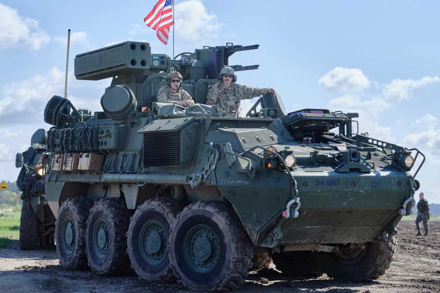 The primary 5-4 ADAR anti-aircraft and anti-UAV system is the M-SHORAD (Maneuver Short Range Air Defence) variant of the Stryker 8×8 armoured fighting vehicle. Normally these vehicles are configured with a four-round Stinger missile pod and a twin Hellfire missile launcher rack either side of the turret, which can also accommodate a 30mm XM914 cannon and 7.62mm coaxial machine gun, but neither missiles nor guns appear to be fitted in the accompanying photos. The Spanish vehicles are armoured URO VAMTACs.