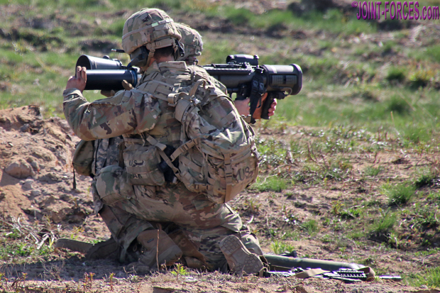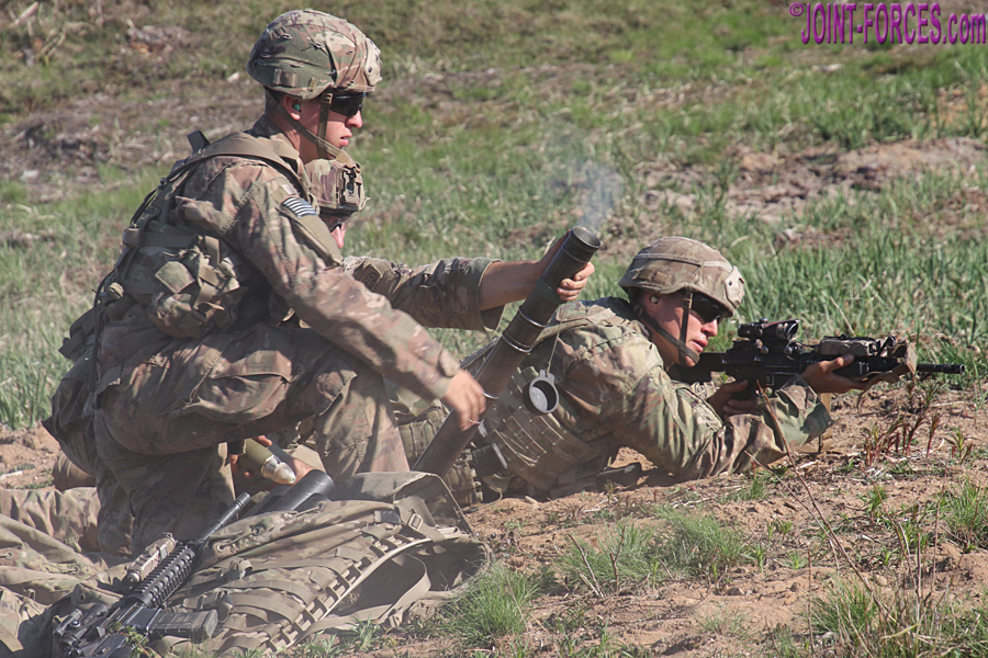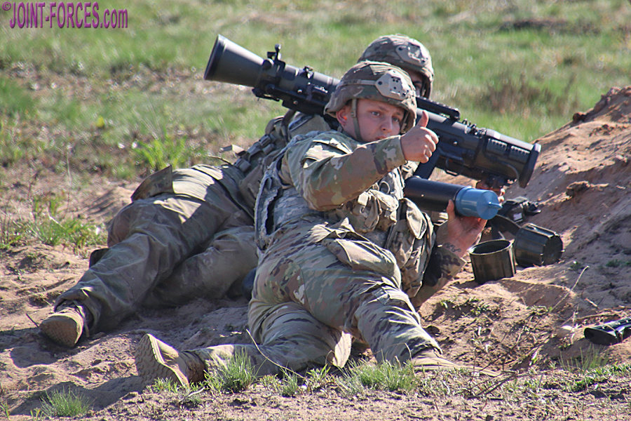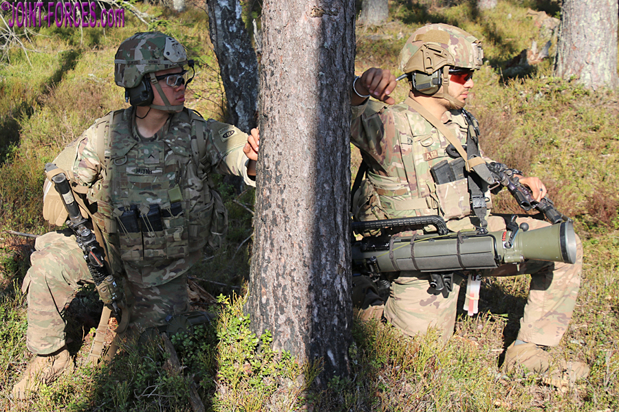 On SWIFT RESPONSE 2021 in Estonia the two medium machine gun teams used the M240L (aka 240 Lima) 7.62x51mm variant of the Belgian FN MAG with 550mm barrel and collapsible stock. A close combat missile team used the M3E1 MAAWS (Multi-role Anti-armour Anti-personnel Weapon System) which is the US designation for the 84mm Carl-Gustaf recoilless rifle; dependent on mission, the FGM-148 Javelin can also be used. Rather than an anti-armour weapon, the fourth team in each of three squads I saw that afternoon used the M224 60mm Lightweight Mortar in hand-held mode.