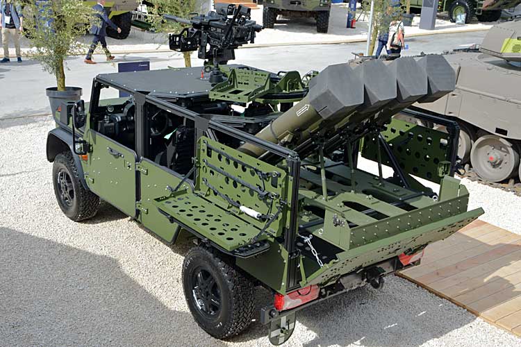 In addition to the Caracal daily demonstrating its off-road capability, powered by synthetic fuel, a second Caracal variant fitted with a quadruple bank of launchers for Hero-120 loitering munitions and a third version with racking in the rear cargo loadbed were static displayed on the Rheinmetall stand.