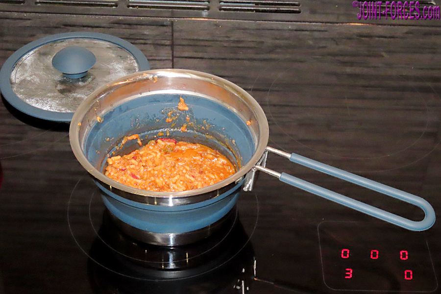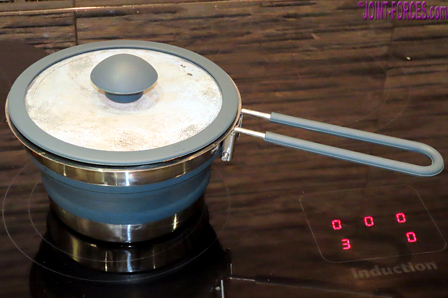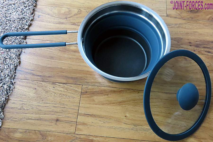 Making cunning use of modern materials and manufacturing methods, Vango bring together stainless steel and silicone to form a pan that is both robust and useable at home as well as when camping. I have used it on my camp stove when out an my travels, as well as on the induction stove at home, and when in transit or for storage you simply squash it flat and fold the handle over the top. All very neat.