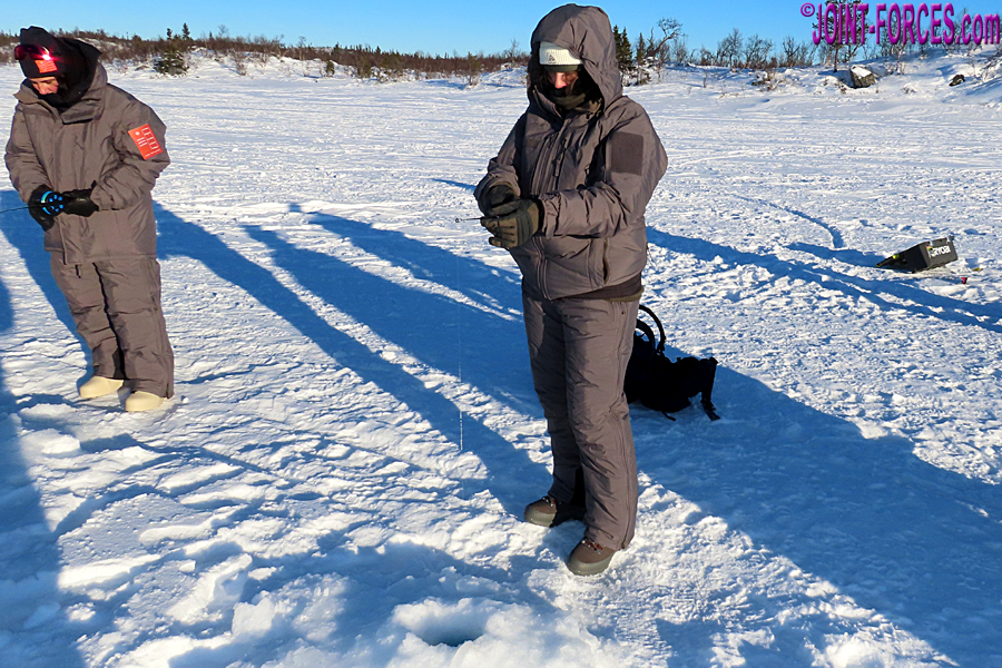 I got back to our now fast-evolving base camp and once again things slowed right down. Fires were lit with stoves up and running, food cooking and hot brews on the go. For us it was a chance to try our hands at fishing through ice holes. Once again, and all part of the overall plan, we were now static following a period of activity. The sun was out but it was very cold though happily no real wind to add to the chill. We had our go at fishing and let’s say it was a good thing we were not depending on our results for our lunch.