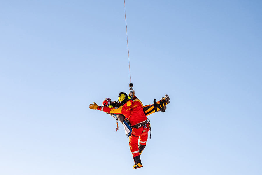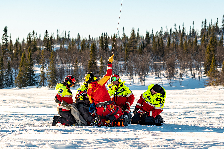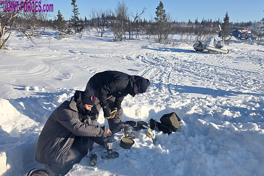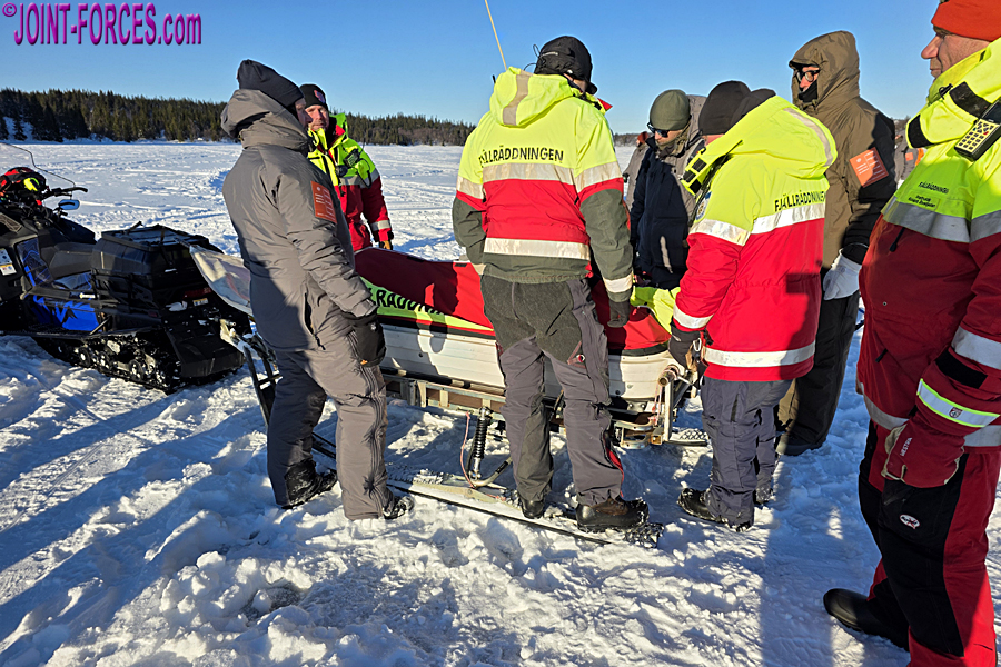 Our support team from the Mountain Rescue Group and the Swedish Army, among others, had magically set up camp and we were fully sustained with reindeer stew and various hot drinks. It was then time for a full-on and very ‘real life’ display by the Swedish Mountain Rescue group who were now joined by the Police Helicopter Service. One of our journalist group had a small accident on the ice the previous evening which brought her into contact with the Mountain Rescue team. They needed a ‘subject’ to be rescued so Beatriz was ‘volunteered’ to be a badly hurt skier. With the full heli-med treatment, she was lifted off the frozen lake and into the rescue helicopter and then flown around and eventually rejoined us. Talking with her later I thought this would be an extremely cold experience for her. She was put on blankets on the ice while being prepared for extraction but when lifted out, which involved flying some distance on the winch cable and into the downwash of the helicopter, she was fine; this comfort was down to the clothes we all had on, which was again testament to the layering system.