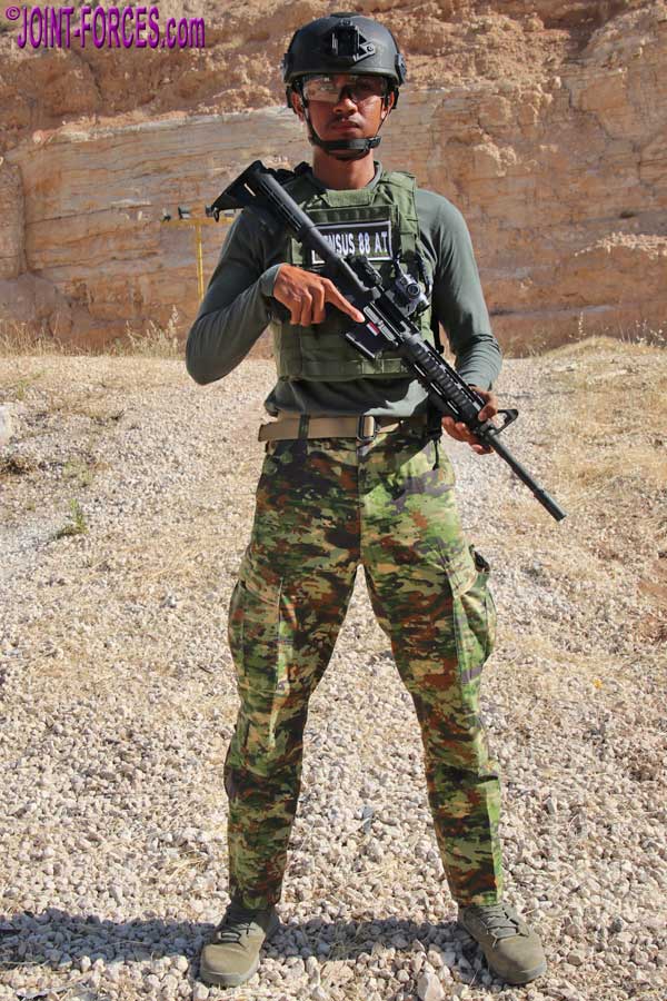 Indonesia’s Detasemen Khusus 88 Antiteror or DENSUS 88 AT is a Police Counter-Terrorism Force formed in direct response to the 2002 Bali bombings, which killed over two hundred people from more than twenty countries. Two teams from this elite unit participated in the 12th ANNUAL WARRIOR COMPETITION at KASOTC (King Abdullah II Special Operations Training Center) this June, and while one of the teams was waiting to take their turn at the Airbus take-down event one of them was volunteered by the Team Leader to quickly pose for our Kit & Camo section.