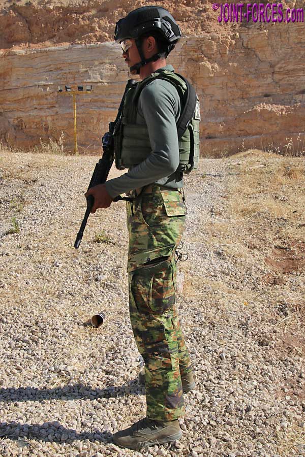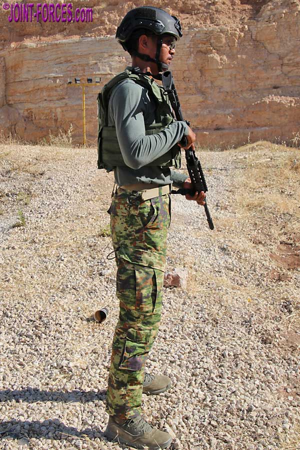 DENSUS 88 is a predominantly horizontal pattern with no straight or near vertical elements, which are the identifiers of MultiCam when compared with Scorpion or the more recent Scorpion W3 pattern now in service as US Army OCP, and although it has a light tan shade as a a tertiary colour it does not have the near-white paint blob and jelly-bean shapes found on MultiCam or OCP. Very much a verdant camouflage, which is unsurprising bearing mind it is intended for wear in The Tropics, it uses three shades of green along with chocolate brown and near-black. Although clearly not a desert pattern, it did not actually fare too badly on those areas of natural vegetation away from the stone quarries inside which most of KASOTC is built. There is actually a small ‘green zone’ out on the ranges, but unfortunately I was unable to photograph the Indonesian teams there to see how their camo worked against that background.