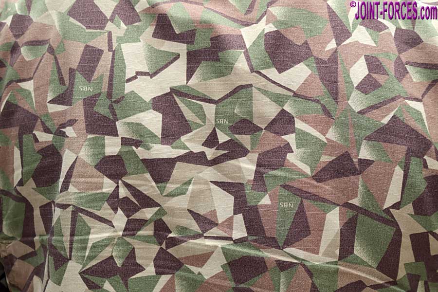 This interesting pattern is predominantly verdant with light and dark green shades, a greenish tan / stone, an earthy brown and a very dark brown being used. Occasionally where a light shade is overlaid on a darker shade it can appear that a sixth colour is present, but I am fairly confident that this is just an optical illusion. Most edges are straight, giving a very angular appearance, but some of the dark green shapes have spattered spray edges which adds to the three-dimensional appearance. Some commentators state that this pattern was designed to confuse near infrared night vision devices but I have yet to see documentary evidence of this.