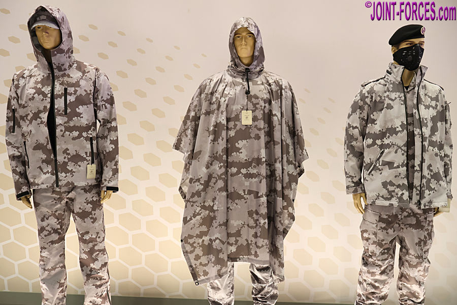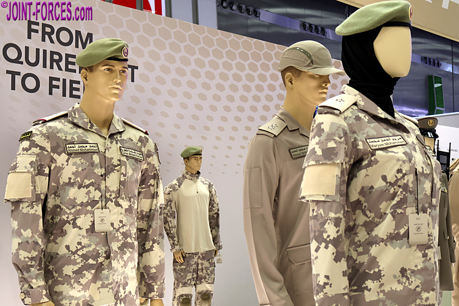 A selection of QAF M2015 uniforms displayed at DIMDEX 2026 in Doha [©BM]