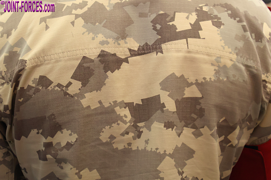 Clearly computer generated, but not really describable as digital or pixelated like the late 20th century CADPAT designs and similar derived patterns which became popular at the start of the new millennium, QAF M2015 is an angular disruptive pattern rather than being mimetic. Obviously the pattern shapes vary considerably in size with straight edges being prominent but, unlike conventional ‘splinter’ patterns, most of the larger Qatari camo shapes also have fragmented edges made up of very small rectangle, rhombus and triangle shapes. The general pattern has an overall horizontal bias and, unlike most ‘digital’ camo patterns, the shapes are neither square nor rectangular.