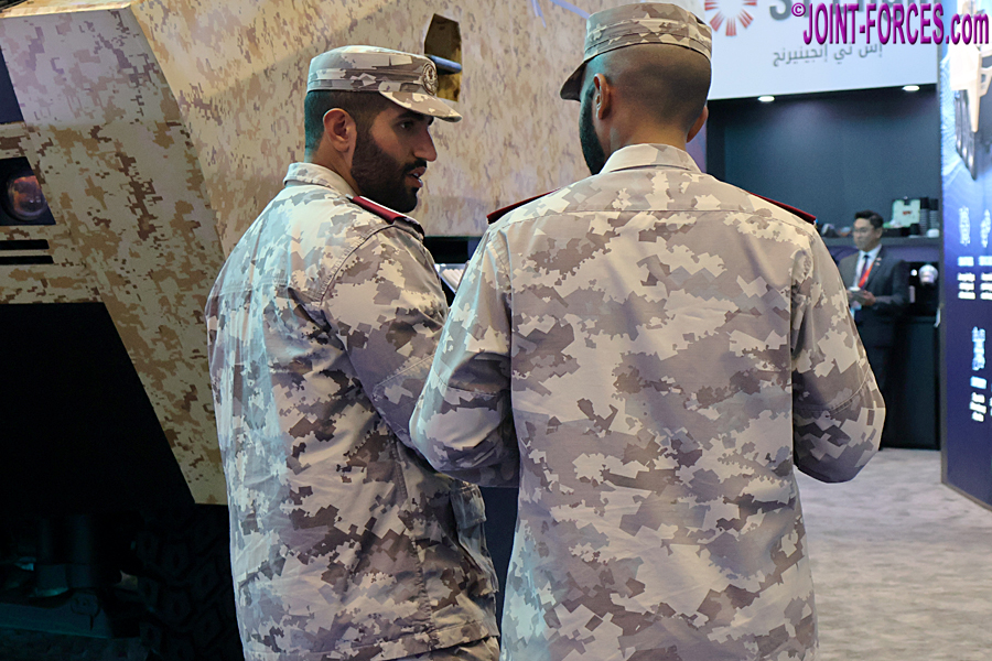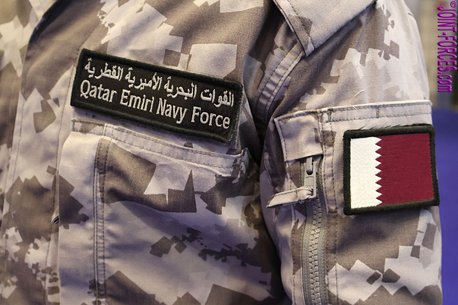Although Qatari Armed Forces (QAF) M2015 pattern is worn by Army, Air Force (including Air Defence Force) and Navy branches of the services, it appears under exhibition lighting that the colours of the Navy uniforms may be a little more greyish than those of the other arms of service, but alternatively the use of different fabrics might just account for the perceived difference. Regrettably I did not get the chance to stand a sailor alongside a soldier or airman in flat daylight conditions, so please don’t take my statement as being definitive.
