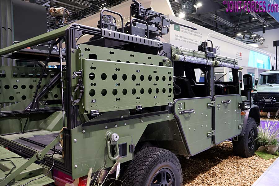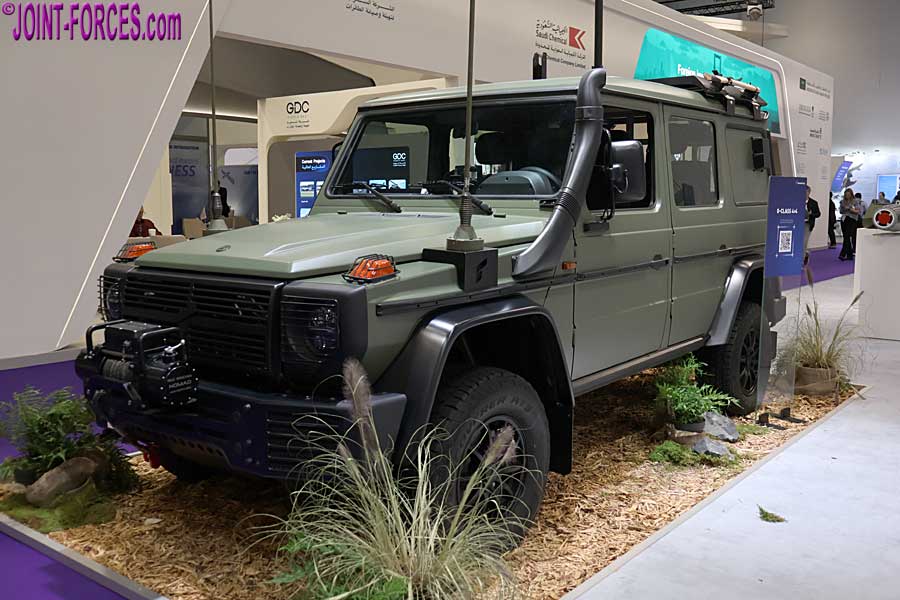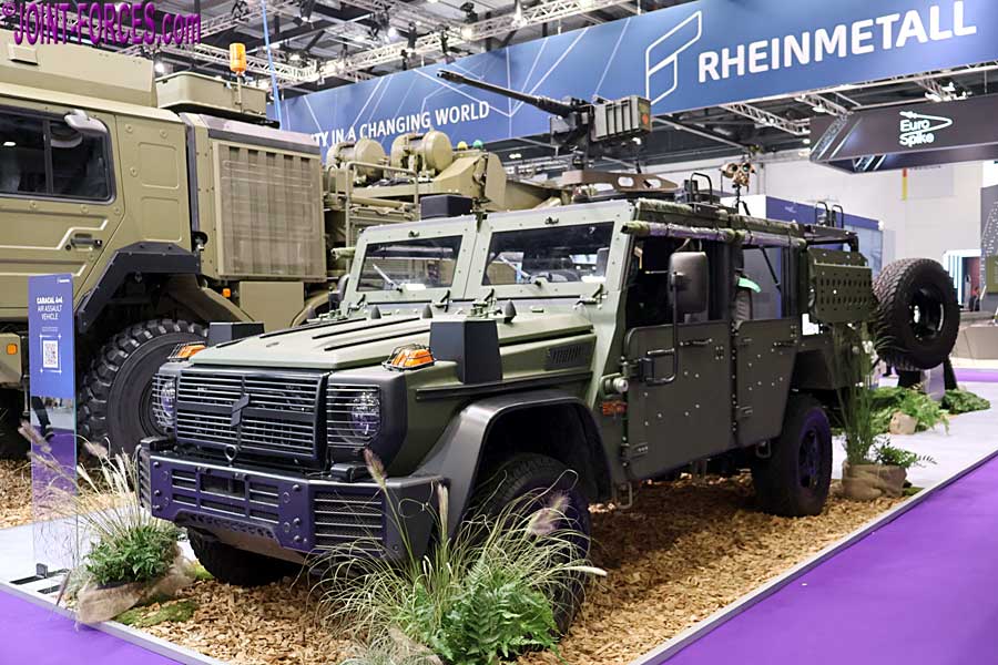 The second vehicle displayed at DSEI UK 2025 based on the Mercedes-Benz G-464 chassis was a Caracal 4×4 Air Assault Vehicle conversion, produced in cooperation with Mercedes-Benz AG and ACS Armored Car Systems GmbH, similar to the vehicle ordered in July 2023 for German and Dutch rapid reaction forces. This demonstrator, configured as an R-WMIK replacement, was displayed with a supplementary armour package; for a fully armoured UK MoD LMV requirement (to replace Defender-based CAV-100 ‘Snatch’ and VIXEN categories) Rheinmetall would be able to supply a similar vehicle to those already in service on the earlier G-461 chassis.