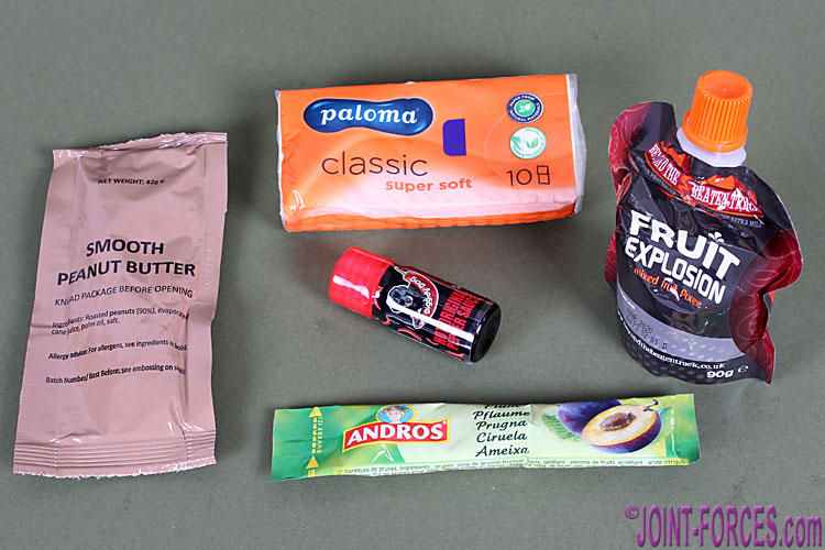 If you have been following this mini-series on UK ratpacks you will notice that not a lot has really changed since 2013, by which point lessons learned from several years of operational experience in Iraq (Op TELIC) and Afghanistan (Op HERRICK) had been addressed. Changes in the 21st Century soldiers’ palate, which had become more cosmopolitan than that of previous generations, had also filtered through meaning that on the whole Brit rations are now pretty widely regarded by other armies as being right up there at the top. The only minor comment I have to make on the 2017 ORP is that the choice appears to be a little wider than before and the only difference I spotted this time around was that one Menu (No.1 and No.11) in each carton of ten is specifically designated as being Vegetarian. There is, of course, a dedicated 10-ORP all-Vegetarian carton option for those who do not eat meat but having one veggie meal in each ordinary 10-pack must help a bit on the logistics side for short deployments; of course there is nothing to prevent omnivores eating, and even enjoying, the occasional meat-free ration but having no dedicated vegetarian menu available in a 10-pack could be seen as an issue for those who choose not to eat meat, or whose religion might prohibit it. As previously, the individual 2017 Pack Date ORP is broken down into Breakfast, Main Meal, Snacks, Drinks and Accessories (listed as Common Components as the Brew/Wet Kit is included here). All items are packed in a single brown cardboard carton, with the cooker and fuel separately issued, though the Common Components include five wind/waterproof matches and a striker strip. The Breakfast selection, across the two standard PD07/2017v2 10-pack cartons includes:- 2x All Day Breakfast; 2x Apple & Cinnamon Muesli with Milk; 3x Chicken Sausages & Beans; 2x Cinnamon Bun; 3x Fruitful Muesli; 1x Fruitful Muesli with Milk; 2x Natural Muesli with Milk; 2x Potato & Beans; and 3x Vegetarian All Day Breakfast. My Menu 6 ORP included a Vegetarian All Day Breakfast retort pouch and, contrary to my expectations, it was not at all bad even though the sausages were meat-free. The Main Meal selection includes a Starter, Main Course and Dessert plus a bottle of Hot Pepper Sauce for those who want to spice things up a bit. The 20 Starters include: 4x Bean & Pasta Salad; 1x Lamb Rogan Josh; 3x Mexican Tuna with Pasta; 3x Moroccan Style Bean Stew; 3x Thai Style Chicken Soup; 2x Tomato & Pasta Salad; 3x Tuna Bean Pasta; and 1x Vegetable Korma. My Menu 6 option was Tomato & Pasta Salad and in my opinion it was very tasty when eaten heated, though I suspect it would also taste good if eaten cold and I reckon adding the Hot Diggidy Dog to it if eating cold would warm you up nicely. All twenty standard ORP Main Courses, three which come with separate Plain Rice pouches, are different and include: Chick Pea Curry plus Plain Rice; Chicken & Mushroom Pasta; Chicken In Yellow Curry with Rice; Sweet & Sour Chicken with Pasta Steak, Vegetables & Dumplings; Indonesian Style Spicy Rice with Pork; Pasta Bolognese; Chicken Massaman with Rice& Potato; Chicken Meatballs & Pasta; Meat Sticks & Rice; Vegetable Korma; Spicy Sausage & Potato Wedges; Beef Meatballs & Spaghetti; Vegetarian Pasta with Beans in Tomato Sauce; Beef Goulash plus Plain Rice; Chilli Con Carne plus Plain Rice; Chicken Jalfrezi with Chickpeas & Rice; Sausage Casserole; Vegetable & Chickpea Biryani; and Chicken & Vegetable Biryani. My sample ration pack contained Indonesian Style Spicy Rice with Pork, which surprised me in its quality and I really enjoyed it even though I doubt it would rate more that two chilli icons if appearing on a restaurant menu. There is less choice when it comes to Desserts, with twelve of the twenty packs containing a Fruit Turnover (Apple x4, Cherry x4 or Blueberry x4). The other eight packs contain either Mince Pie (x3) or Ginger Pudding & Ginger Sauce (x3) or Sticky Toffee Pudding (x2). I have come across that Ginger Pudding dessert before, most recently in the 2015 Halal ORP, and I did not go a bundle on the texture, but this time the pudding contained in my Menu 6 was actually much better so maybe those DE&S Feedback Forms actually work. There are between four and seven individual items supplied in the Snacks section of each of the twenty Menu options and choice is again quite varied. Fifteen of the packs have a fruit purée squeezy bottle, in one of several different flavours, with four of the others having packs of sweets (Boiled or Cola) and the last having a pouch of Tuna in Light Mayonnaise. Each pack usually also has biscuits or an oatmeal block plus at least one cereal bar as well as usually a pack of nuts or dried fruit or fruit & nut mix; there is the odd pack that doesn’t have one or other of these but will have a Tuna pouch instead. Occasionally Jam or Peanut Butter is included to balance the calorific value where necessary. On the Drinks side, five sachets are included in each Menu with one being Fortified, one being Hot Chocolate and the other three being Fruit flavoured; again there is quite a bit of variety and even the Hot Chocolate powder comes in three different flavours (Regular, Mint and Orange). As previously mentioned, Coffee Powder x2 and Tea Bags x2 are also provided along with Sugar x4 and Beverage Whitener x4 – the latter are Common Components along with Water Purification tablets, Chewing Gum, Wet Wipes x2, a pack of Tissues, a plastic Spork and a Re-useable [sic] Polybag for collecting rubbish and empties. All-in-all, the British ORP of 2017 is pretty comprehensive and, in my opinion, a lot better than the offerings many other nations provide their troops with in the field.Footnote: I have previously mentioned the alternative Cold Climate Ration issued to troops on Winter Deployments in Norway and some might be wondering why the CCR was not used on the recent Ex TRIDENT JUNCTURE 18. When I asked this question, a 1 LANCS officer explained 