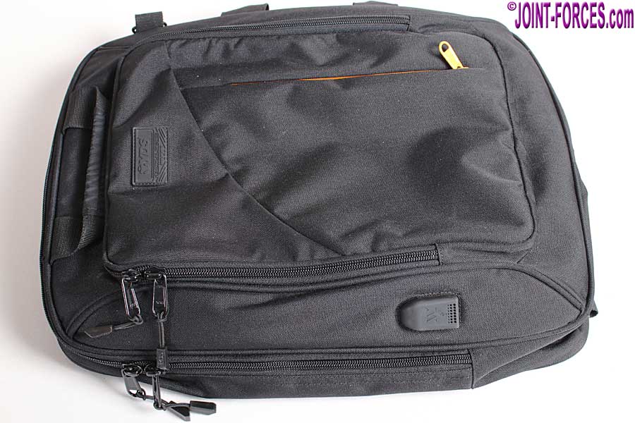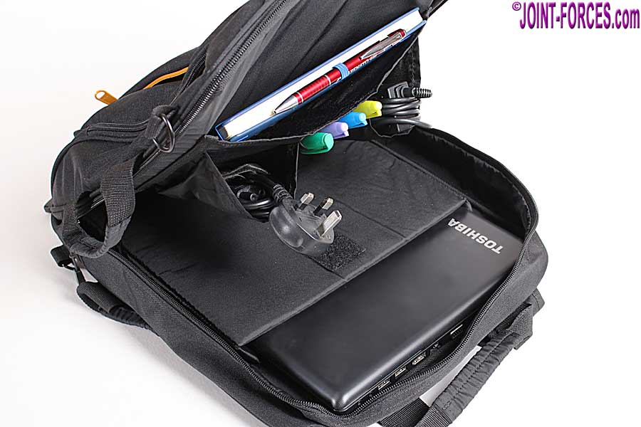 Measuring 41x32cm and around 15cm deep, so well within airline ‘under seat’ dimensions, this black polyester bag is sized to accept a conventional laptop up to 15-inch (38cm) in a sponge-padded pouch inside the main compartment. If carrying a smaller laptop, there is a broad retaining strap with Velcro to prevent movement and the rear of the main compartment is also padded for additional protection. Behind the main compartment zipped lid there is a small pouch pocket / organiser panel with four pen pockets and two smaller pouch pockets; of course these pockets only work if the bag is carried vertically.