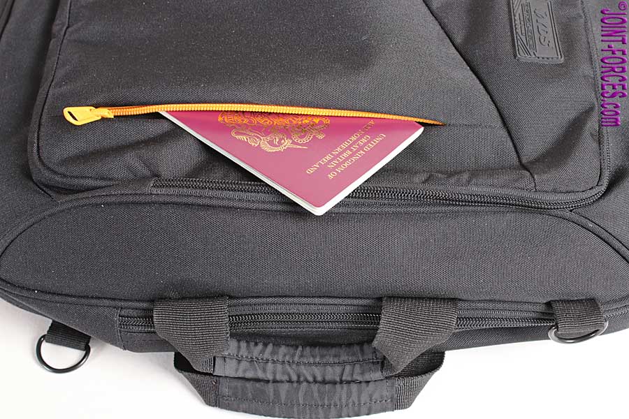 Both compartments have double action zips, with pull tabs, which allow for three-quarter opening. There is also a small zipped pocket on the front face of the bag, which can be used to store the removable adjustable side strap when not in use. This pocket is also handy for holding quick access documents and accessories etc., but although I have used a passport here for illustration purposes, on security grounds I would never recommend carrying anything valuable in there if wearing the bag rucksack-style; there are way too many sticky-fingered people in the world. All zips used are high quality YKK type.