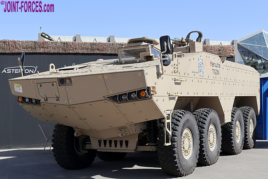 Hanwha Aerospace is displaying a full-size TIGON 6×6 wheeled armoured vehicle fitted with a Remote- Controlled Weapon Station (RCWS), alongside scale models of the 4×4 and 8×8 variants. The display is designed to highlight the TIGON family’s adaptability across different missions and terrain conditions.